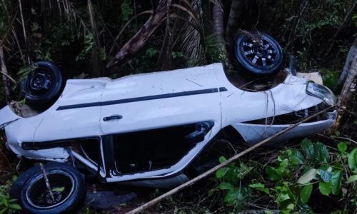 O motorista relatou para a corporação que por causa da chuva intensa, perdeu o controle da direção, saiu da pista e caiu em um barranco de, aproximadamente, 200 metros.