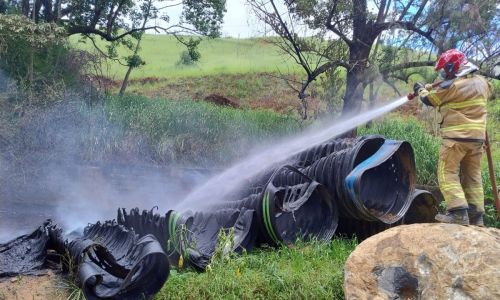 Um incêndio danificou um conjunto de tubos de PVC corrugado utilizados em obras de drenagem para captação de água da chuva no Bairro São Bernardo, em Juiz de Fora, neste domingo (5).