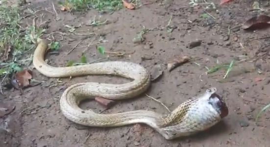 Um vídeo que circula nas redes sociais mostra uma cobra que se engasgou ao tentar engolir um vidro de xarope para a tosse na Índia, na cidade de Bhubaneswar. O animal não conseguiu regurgitar o objeto e precisou da ajuda de voluntários, que empurraram o vidro para fora da boca do animal.