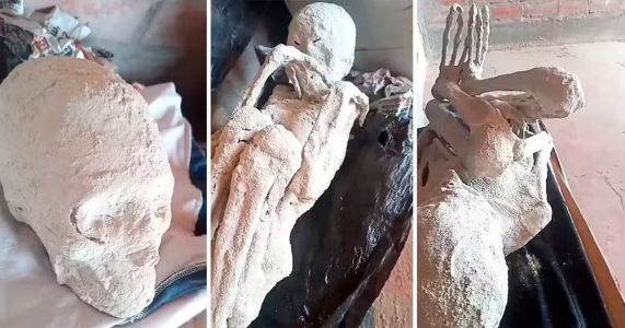 Além disso, a reportagem dá conta de que as "criaturas" têm "crânio alienígena" e estão fossilizadas, características idênticas às outras múmias que já foram encontradas na região de Nazca, naquele país, há algum tempo.