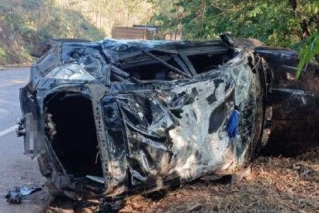 Um capotamento envolvendo um carro modelo Ford Fiesta mobilizou equipes de resgate na manhã deste sábado (25), na BR-356, na altura da Serra da Santa, em Itabirito, na Região Central de Minas Gerais.