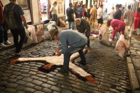 A partir do período noturno, participantes se distribuem pelo Centro Histórico para iniciar a confecção dos tapetes. A atividade utiliza serragem, areia e outros materiais aplicados diretamente nas ruas. Os desenhos seguem referências ligadas à tradição cristã e são organizados ao longo do trajeto por onde passará a procissão.