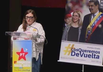 Um banner exposto no Congresso Nacional do PT (Partido dos Trabalhadores), que acontece neste final de semana, em Brasília, pediu a volta de Nicolás Maduro e de sua esposa, Cilia Flores, à presidência da Venezuela.