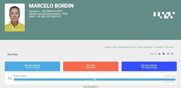 Candidato pelo PSD à Câmara Municipal de Orlândia, em São Paulo, Marcelo Bordin — um aposentado de 59 anos de idade — lidera a lista de candidatos que mais doaram recursos próprios às suas campanhas.