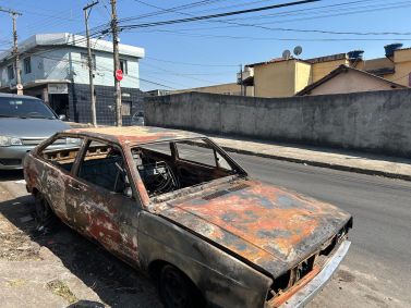 De acordo com moradores, o carro está parado na rua há anos, mas foi incendiado recentemente.