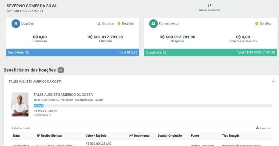 Quase todas as doações registradas pelo piscicultor Severino Gomes da Silva foram de R$ 500 e R$ 1.000, mas uma delas destoa das demais. O sistema do TSE mostra um registro de transferência de R$ 500.001.281,90 a Tales Augusto Américo da Costa, candidato a vereador em Capinópolis. O repasse foi registrado no dia 23 de agosto e, até o momento, não houve retificação no sistema da Justiça Eleitoral.