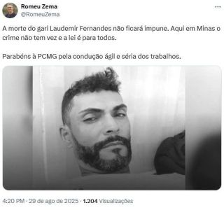 "A morte do gari Laudemir Fernandes não ficará impune. Aqui em Minas o crime não tem vez e a lei é para todos. Parabéns à PCMG pela condução ágil e séria dos trabalhos."