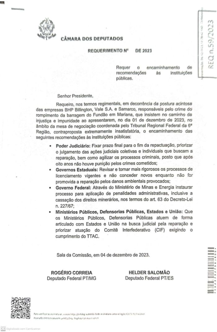 A Comissão Externa da Câmara dos Deputados engrossa o coro da justiça de quem essas discussões do acordo já estão se arrastando por tempo demais. Os deputados federais Rogério Correia (PT-MG) e Helder Salomão (PT-ES) encaminharam ao Presidente Lula (PT) um documento pedindo que seja fixado um prazo final para que o acordo seja fechado. O requerimento também foi enviado ao poder judiciário, governos de Minas e Espírito Santo, além de Defensorias Públicas e Ministérios Públicos.