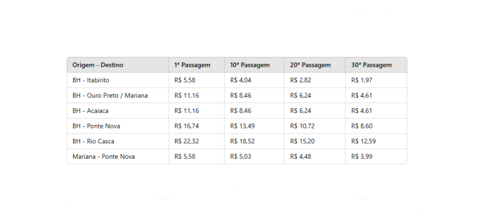 Durante a apresentação, a Secretaria de Estado de Infraestrutura, Mobilidade e Parcerias (Seinfra) exibiu uma tabela projetando os valores dos pedágios — que serão cobrados após a realização dos serviços previstos para o primeiro ano de contrato. O motorista que for de Belo Horizonte a Ouro Preto ou Mariana, por exemplo, pagará R$ 11,16. Já a viagem da capital a Ponte Nova custará R$ 16,74, enquanto o pedágio do trecho entre BH e Rio Casca será de R$ 22,32. O plano também prevê descontos para usuários frequentes (confira os valores na tabela abaixo).