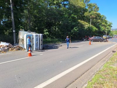O tombamento ocorreu após o caminhão ser atingido por um veículo de passeio Fiat Cerato. O carro ficou também com a frente bastante destruída. Um motociclista que passava pelo local no momento também acabou sendo envolvida no acidente, mas sem gravidade.