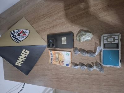 Entre os materiais apreendidos estão 07 buchas de maconha, 1 porção de maconha, 1 balança, 1 celular e 50 euros, em dinheiro.